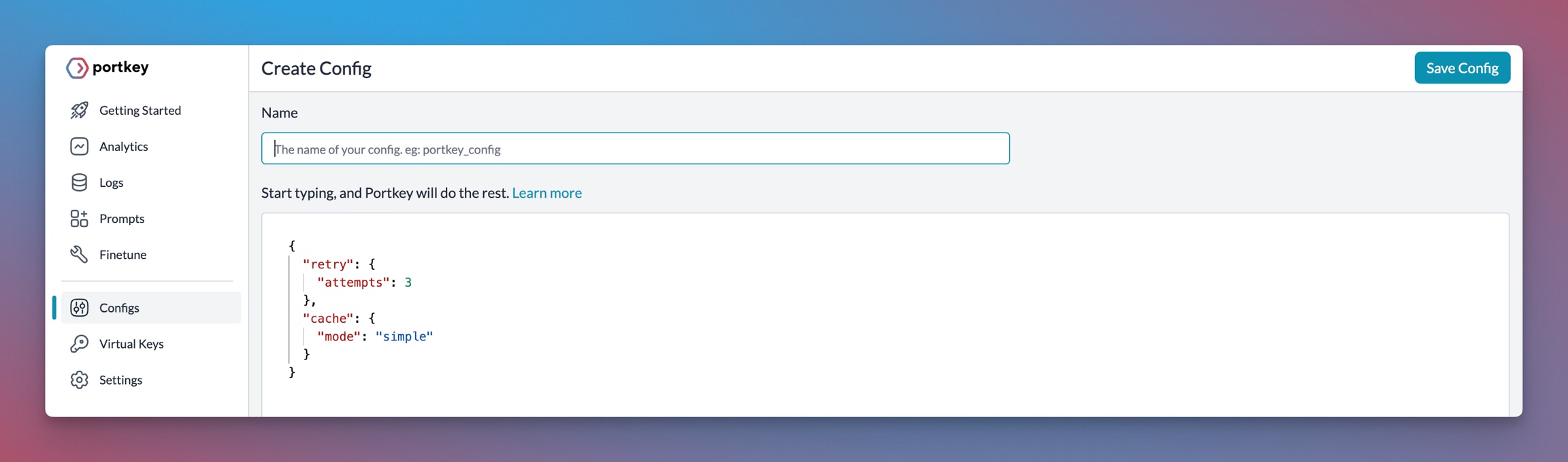 Head over to the Configs tab in Portkey app where you can save various provider Configs along with the reliability and caching features. Each Config has an associated slug that you can reference in your Llamaindex code.