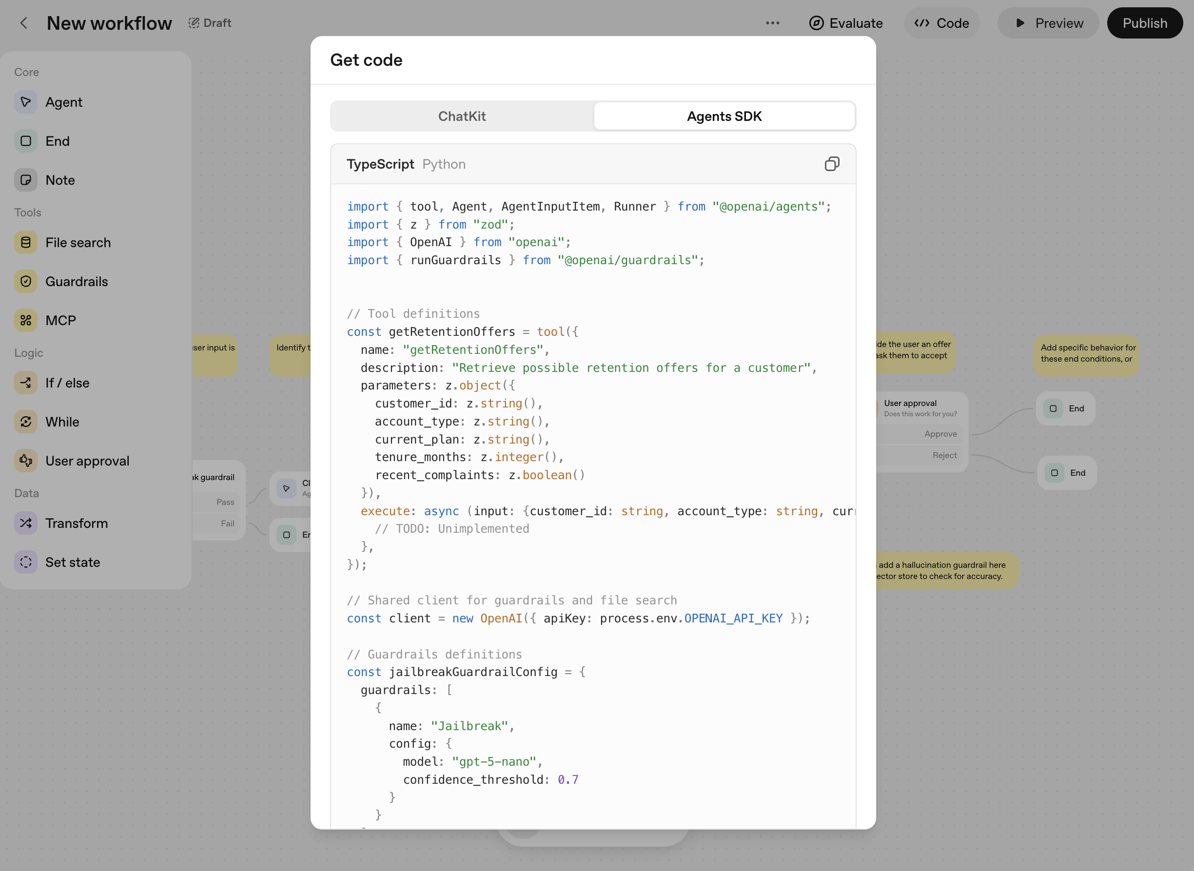 Once your workflow is ready, click Code in the top navigation and select Agents SDK to get the Python implementation of your workflow.