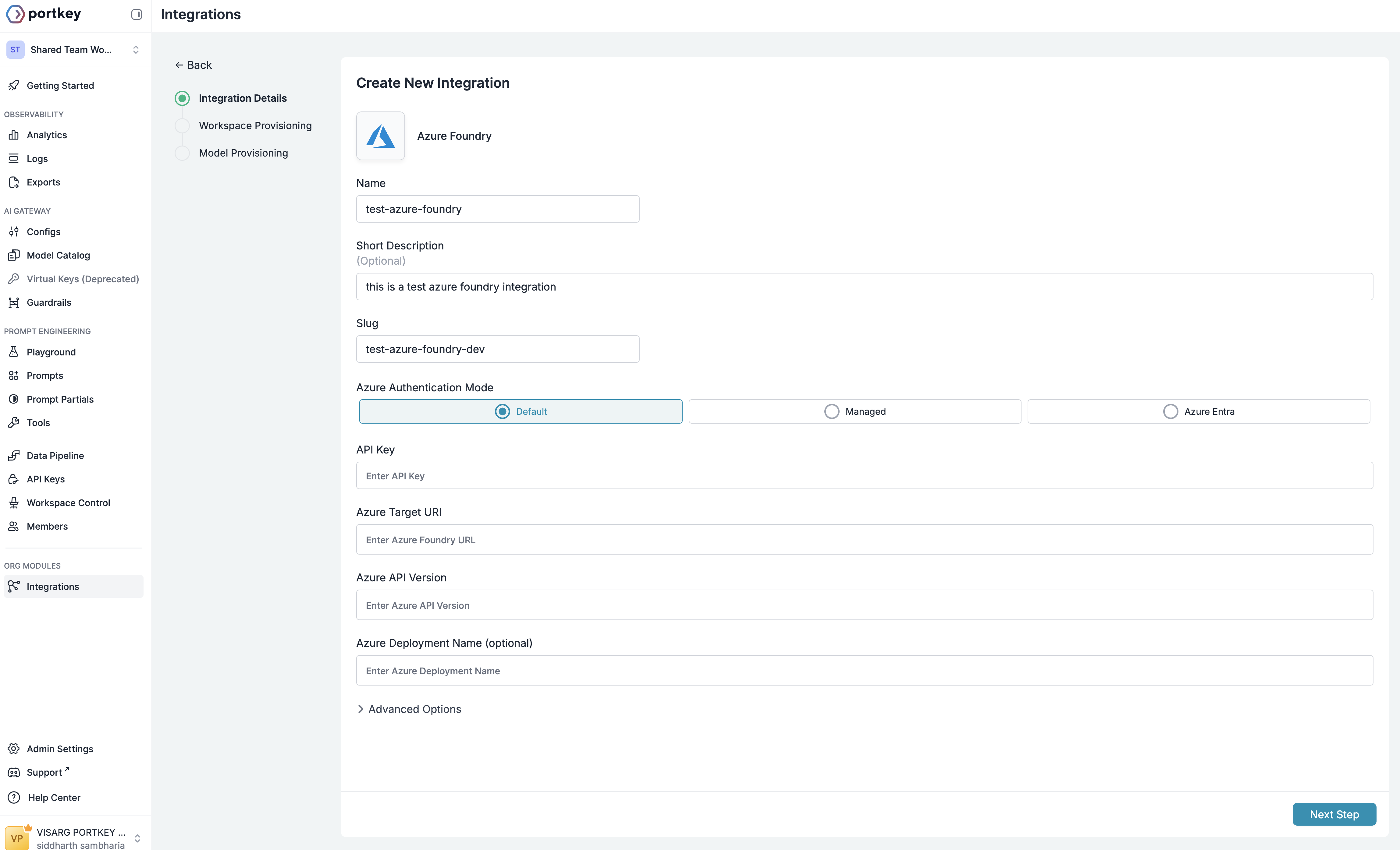 Fill in the basic information for your integration:- Name: A descriptive name for this integration (e.g., “Azure AI Production”)